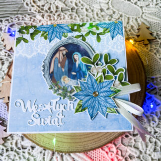 Głównym elementem kartki jest piękna grafika z motywem Stajenki