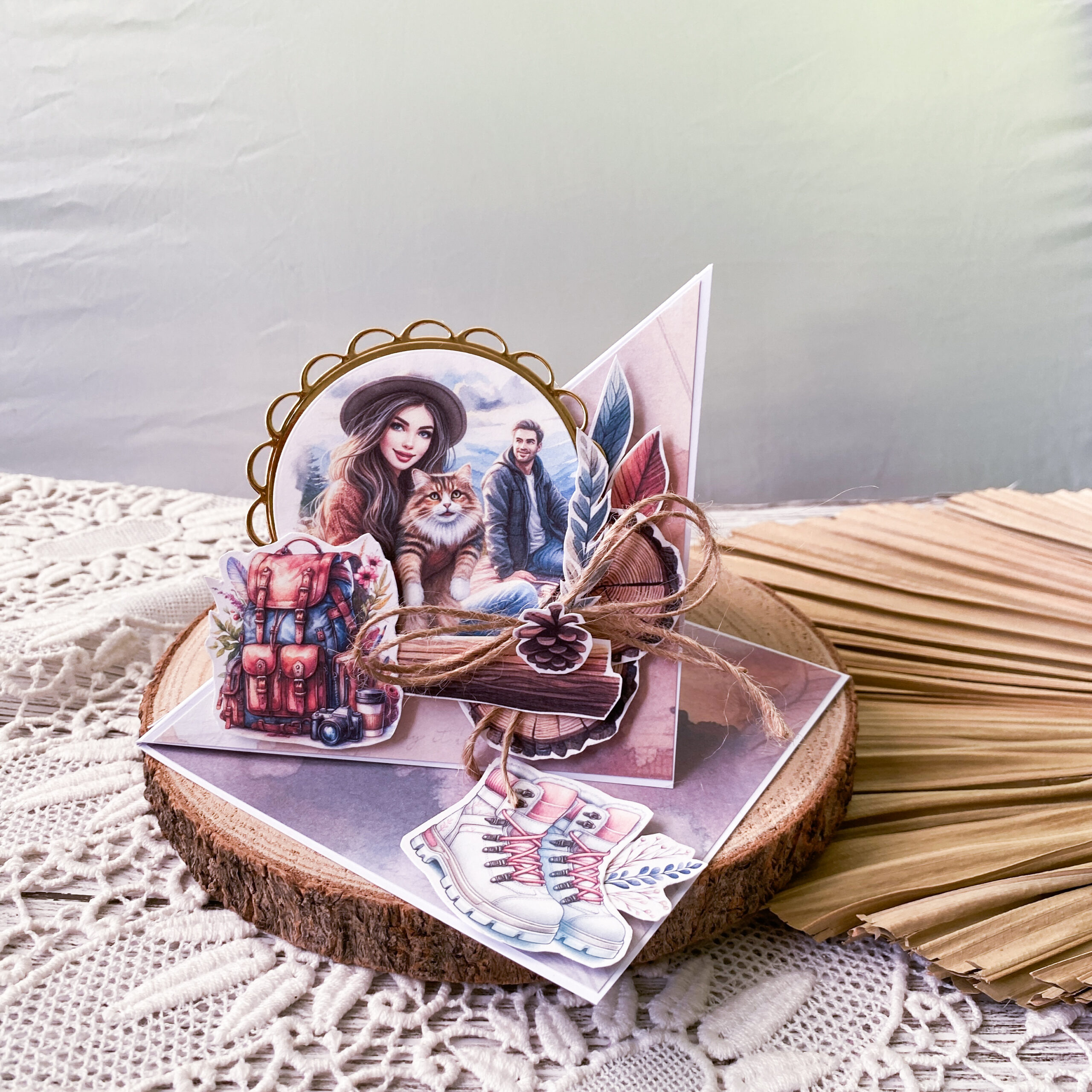 Kartka wykonana z wysokiej jakości materiałów.Do jej wykonania zostały użyte papiery i sznurek jutowy.