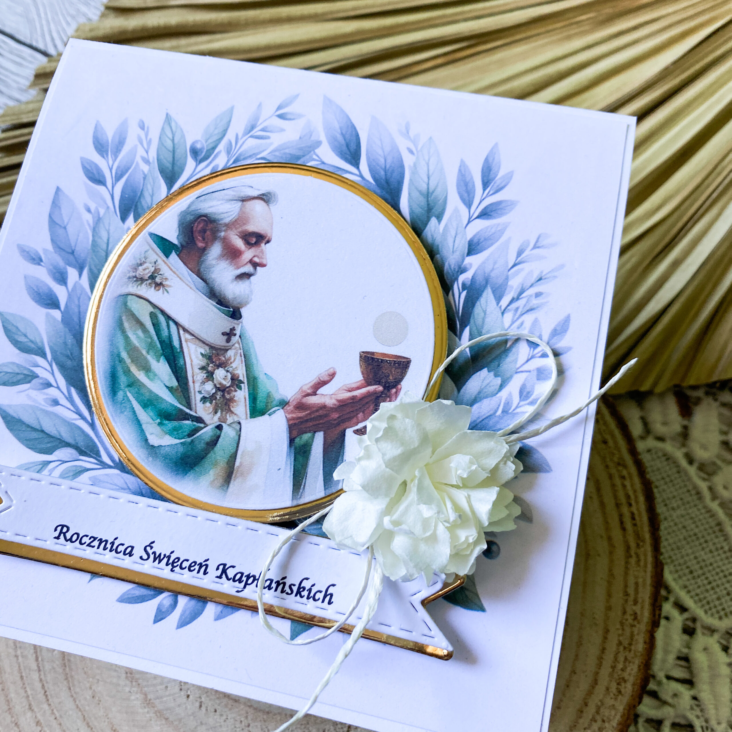 Wyjątkowa, ręcznie wykonana kartka z okazji Rocznicy Święceń Kapłańskich. Kartka jest w biało-zielono-złotej kolorystyce.