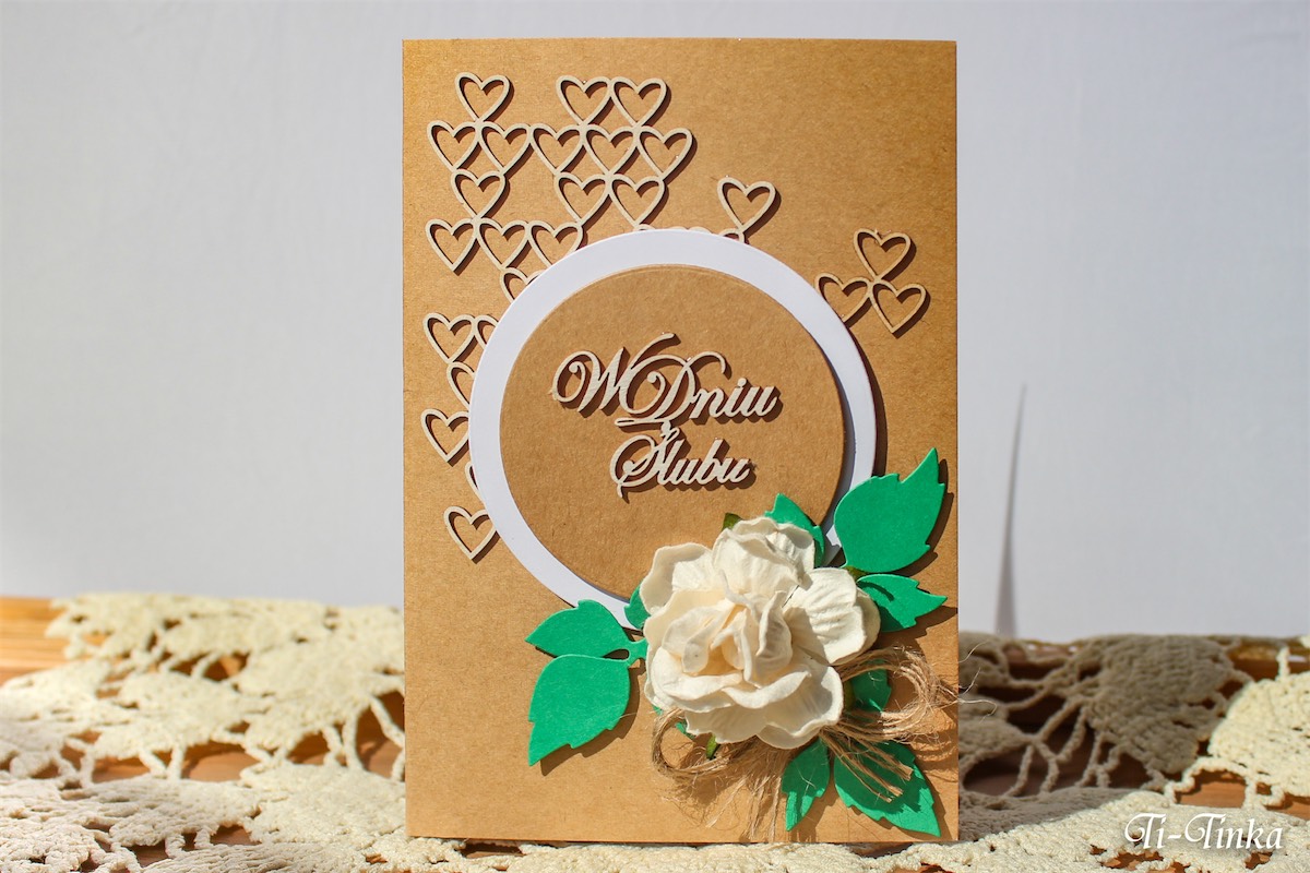 Ręcznie wykonana kartka ślubna w stylu rustykalnym. Kartka wykonana z wysokiej jakości materiałów. Nie zawiera życzeń. Kartka jest sprzedawana w komplecie z kopertą.