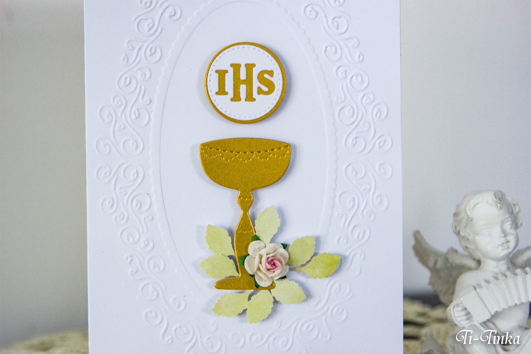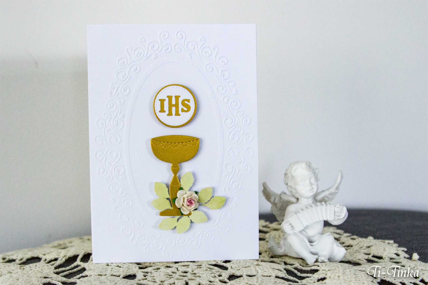 Skromna i elegancka ręcznie wykonana kartka na Pierwszą Komunię Świętą.